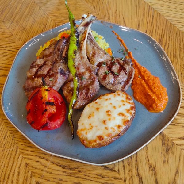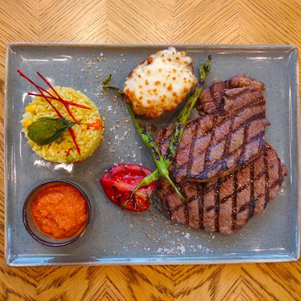 Dana Antrikot(300 gr), Patates Sufle, Köri ve Sebzeli Pirinç Pilavı, Izgara domates ve biber, Nazuktan Sos