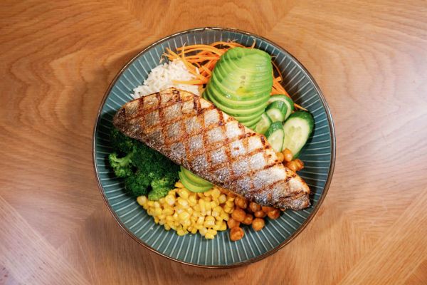 Izgara Levrek Fileto, havuç, brokoli, avokado, salatalık, tereyağlı basmati pilavı, mısır, baharatlı kıtır nohut , sweetchill biber sos