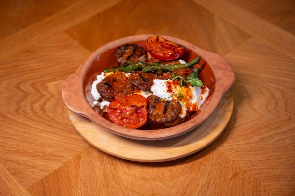 Izgara köfte (150gr), tereyağlı tırnak pide parçaları, külbastı sos, yoğurt, domates, yeşil biber