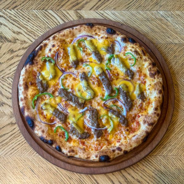 Mozzerella Peyniri, Köfte Parçaları (120 gr), Taze Domates Sos, Kırmızı Soğan, Yeşil Biber , Çedar Peynir